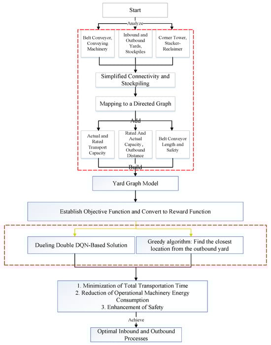 The structure of this paper is as follows: Section 3 highlights the present issues and possible solutions, along with the operational processes of dry bulk terminals. Section 4 develops the objective functions, sub-models for operational process parameters, and the yard structure model, anchored in the mathematical foundations of operations research. Section 5 discusses the solution strategy employing deep reinforcement learning. An empirical validation case study based on Qingdao Port is offered in Section 6. Finally, the results are analyzed, and prospective avenues for further research are given.