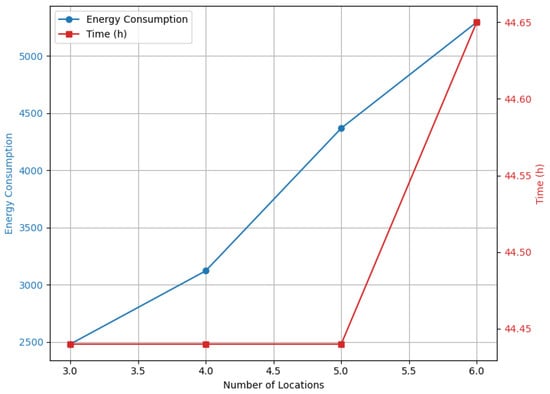 Table 10 and Figure 11 demonstrate that when the number of stored goods changed, for instance, from 3 to 4, the change in energy consumption was not particularly significant when compared to the subsequent adjustment; however, when the number of stored goods changed from 4 to 5, the change rate of energy consumption would gradually increase; that is, job energy consumption will increase more quickly as the number of storage slots increases. This indicates that the vacant area should be arranged before each operation in order to reduce the number of vacant spaces and improve efficiency while maintaining the same vacant capacity. Additionally, it demonstrates that this study can offer improved answers to the bulk storage yard’s employees, which offers a theoretical foundation for the bulk storage yard’s planning.