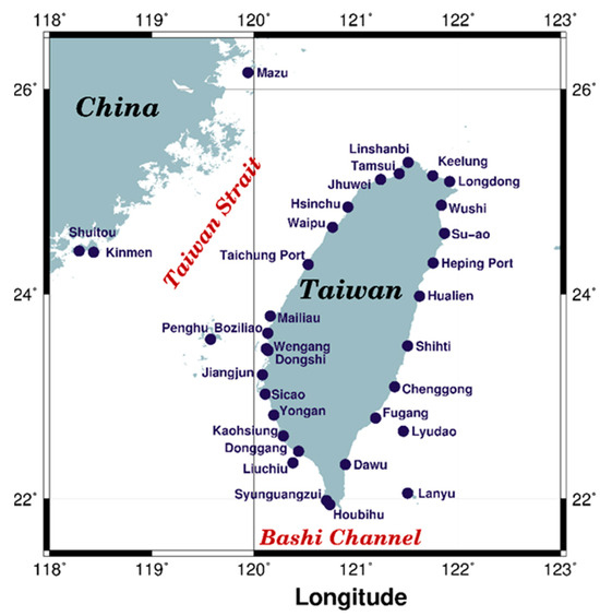 This study used data from 34 tide gauge stations in Taiwan, with their locations shown in Figure 1. The tide gauges are primarily distributed along the coast of Taiwan’s main island, with more distant stations located in Kinmen, Shuitou, and Mazu, covering diverse environmental conditions. Relevant information about the gauges is presented in Table 1. The tide gauge stations are established and maintained by various organizations, including the Ministry of the Interior, the Central Weather Administration of the Ministry of Transportation and Communications, the Transportation Technology Research Center, and the Water Resources Agency of the Ministry of Economic Affairs, among others. Data management is centralized under the Central Weather Administration, which provides data at a sampling interval of 6 min.
