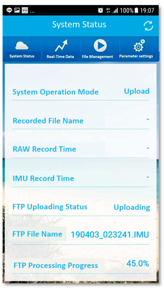 Figure 3. A custom-developed mobile app device was used to control the start and stop of GNSS/IMU data recording, upload data to the backend server, query the current GNSS/IMU position of the buoy, and check its recording status. - (6)