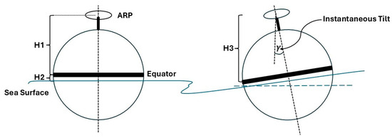 where α is the roll angle and β is the pitch angle. Since the distance from the buoy’s equator to the sea surface, denoted as H2, is very small, it is assumed to be zero. The distance from the Antenna Reference Point (ARP) to the buoy’s equator (H1) is known (left panel of Figure 4). When the buoy tilts (right panel of Figure 4), the distance from the ARP to the sea surface (H3) can be calculated using the trigonometric relationship between H1 and the tilt angle γ. The height correction (HC) due to buoy’s tilt is obtained as the difference between H3 and H1, as shown in the following equation [32].