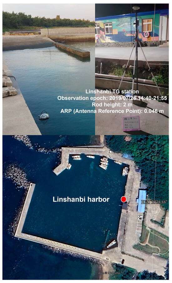GNSS/IMU buoy deployed in Linshanbi harbor on 28 July 2019. (top-left panel) GNSS/IMU buoy in operation, (top-right panel) GNSS measurements at the tide gauge benchmark, and (bottom panel) observation site in the harbor (indicated by red circle).