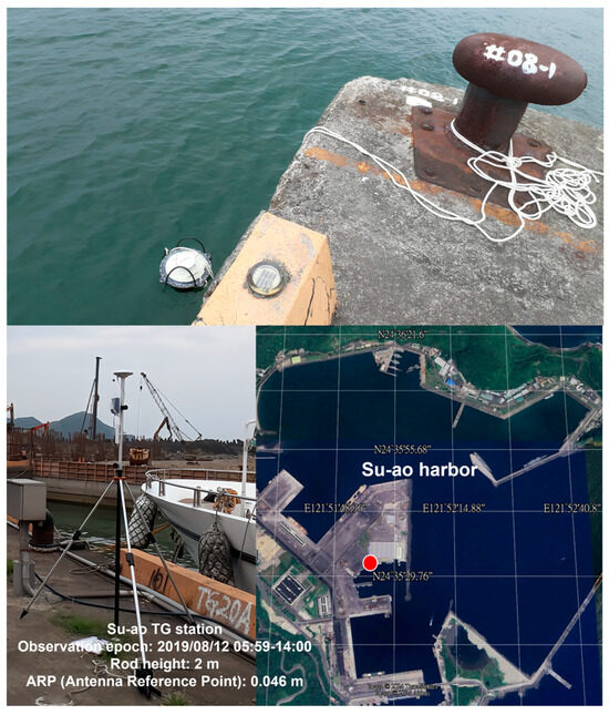 GNSS/IMU buoy deployed in Su-ao harbor on 12 August 2019. (Top panel) GNSS/IMU buoy in operation, (bottom-left panel) GNSS measurements at the tide gauge benchmark, and (bottom-right panel) observation site in the harbor (indicated by red circle).