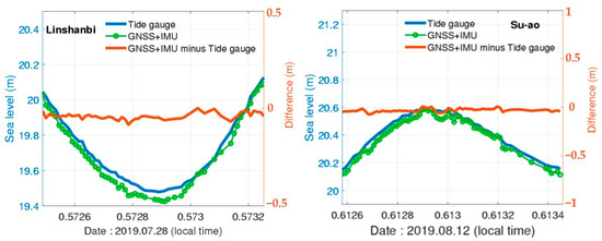 After processing the GNSS observational data by relative positioning, GNSS/IMU integration was performed using a loosely coupled solution. The GNSS/IMU integrated solution was recorded at a frequency of 1 Hz, while the tide gauge data were recorded with sampling intervals of 6 min (1/360 Hz). For comparison, the GNSS/IMU data were averaged to one data point every 6 min, excluding data points with less than 70% of observations. The tide gauge and GNSS/IMU data were then compared after both were converted to the TWD97[2010] ellipsoid heights. The STD of the differences between the tide gauge and GNSS/IMU data was calculated, and the GNSS/IMU integrated solution (one data point every 6 min) was considered an outlier if the difference was larger than 3 STD. Finally, the mean and STD of the differences between the two datasets were calculated.