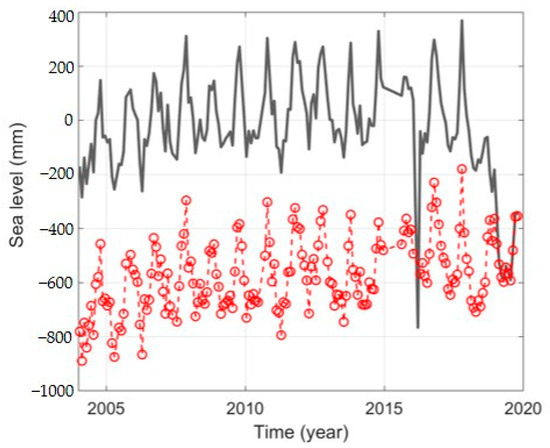 Monthly mean of Shuitou tide gauge records. Black line is original tide gauge data and red-circle-dash line is tide gauge data after datum shift corrected.
