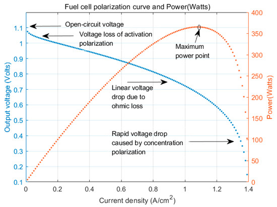 In a PEMFC, energy is supplied to the load and other electrical units by converting chemical energy into electrical energy. This complex process of energy conversion involves nonlinear control conservation equations, such as those for electrode dynamics, electrochemistry, thermodynamics, and fluid mechanics. Its performance in outputting electrical energy to the external environment depends on the membrane’s water absorption state, the membrane’s current density, and the voltage loss caused by the activation overpotential, ohmic overpotential, and concentration overpotential induced by the gas excess ratio. The performance of the cells can be characterized using a polarization curve. The polarization curve shown in Figure 2 was obtained from an operating experiment on an air-cooled PEMFC.