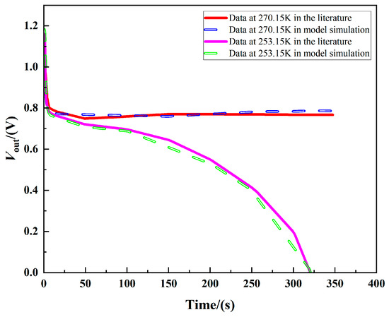 Comparison between model predictions and experimental data on PEMFC voltage (270.15 K and 253.15 K).