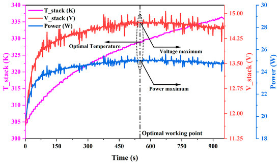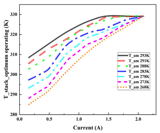 As can be seen in Figure 6, there is a peak voltage point in the working process of the air-cooled PEMFC, i.e., the best working temperature point (corresponding to the temperature at 9 min after the experiment begins). With an increase in the stack’s operating temperature, the stack voltage presents a trend of first rising and then decreasing, and the highest output voltage appears near a certain temperature value, which corresponds to the highest output power at 1.7 A. Therefore, the optimum operating temperature points under different environmental conditions can be obtained by controlling the temperature of the PEMFC stack. The relationship between the optimal working temperature of the stack and the load current under the conditions of an ambient temperature of 268.15 K~293.15 K and an RH of 60% is shown in Figure 7.