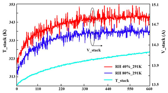 In an air-cooled self-humidifying PEMFC, part of the water in the PEM comes from the water generated by the reaction, and the other part comes from the air; thus, the ambient humidity will affect the output characteristics of the PEMFC. Figure 8 shows the relationship between the output voltage, stack temperature, and ambient humidity at an ambient temperature of 291 K and a current of 1.5 A. In this case, the environmental humidity is set to various low values that are characteristic of China’s Antarctic coastal research stations.