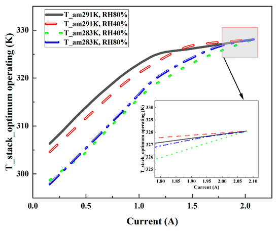 The relationship between the optimal working temperature of the stack and the load current under the conditions of ambient temperature (283 K, 291 K) and ambient humidity (40%, 80%) is shown in Figure 9.