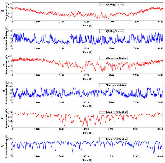 Meteorological curves in Antarctica: (a) temperature at Qinling Station; (b) RH at Qinling Station; (c) temperature at Zhongshan Station; (d) RH at Zhongshan Station; (e) temperature at Great Wall Station; (f) RH at Great Wall Station.