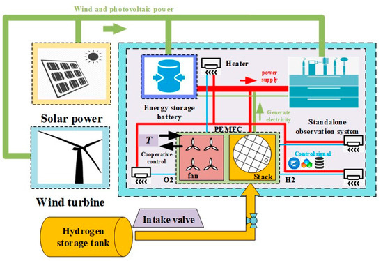 Hydrogen energy generation plays a crucial role in enhancing the utilization of clean energy at coastal stations with abundant wind and solar resources in Antarctica. In response to the reliable demand for the application of hydrogen fuel cells in standalone observation systems in Antarctica, in this research, a power supply scheme based on a proton exchange membrane fuel cell (PEMFC) is introduced. Transient models of the PEMFC are developed, and the optimum operational and environmental conditions are determined through experimental investigations conducted at low temperatures. Based on the findings, a PEMFC-based power supply system is designed, encompassing a fuel cell stack, a measurement and control system, and an operation cabin. A temperature-coordinated control system leveraging a BP neural network, fuzzy logic rules, and the fuzzy-based active disturbance rejection control (Fuzzy-ADRC) strategy are proposed to ensure that the temperature of the PEMFC and cabin can reach the optimal state rapidly and that the output voltage is stable. The results indicate that the stack temperature reaches the specified value more rapidly than with PID and ADRC control methods when the current loading and changes in the ambient temperature are considered, and the output voltage oscillation amplitude can be more effectively minimized. This research provides preliminary guidance for a reliable energy supply scheme for PEMFCs, especially in standalone observation systems in coastal locales.