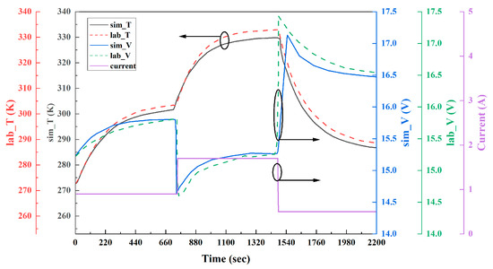 As can be seen in Figure 13, when the temperature is stabilized (t = 719 s, t = 1480 s), the difference between the simulation (sim_T) and experimental (lab_T) results are 1.1 K and 3 K, respectively. The larger the current, the larger the difference between the two. The reason for this is that in the simulation model, the PEM is 100% humidified by default. However, in the experiment, the PEMFC cannot achieve complete humidification, i.e., the RH is not 100%. The dynamic voltage of the PEMFC according to the simulation and experimental results is also consistent. When t > 1470 s, the experimental voltage (lab_V) is slightly higher than the simulation voltage (sim_V). This is because the output voltage of the PEMFC is higher after the operation at a high current, the water content of the PEM increases, and the stack temperature is higher. Then, the stability values of the experiment under the step change in the current are slightly higher than the simulation values. Under the condition that the RH is less than 100%, at the initial current loading, the ohm overpotential brought by the low humidity in the stack is larger than that under 100% humidity, so the experiment value is low. With the continuous loading and step change in the current, the water generated in the stack continuously accumulates, and the overpotential decreases. Thus, the output voltage of the stack in the experiment is gradually greater than the simulated value, even when the experimental result shown in Figure 13 is that the higher temperature value promotes the evaporation of vapor. Moreover, the objective constraints of the seamless implementation of the control method in the hardware control module, such as data transmission and command delivery delay, are also the key reasons for the difference between the experimental and simulation results. Therefore, it can be considered that the PEMFC temperature model is accurate within the allowable error range.