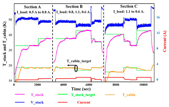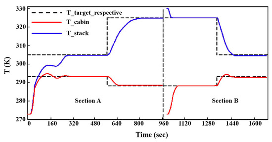 As shown in Figure 15, the PEMFC is set to 0 A, the initial temperature of the cabin is 273 K, and the current varies from 0.5 A to 2 A. Due to the existence of a heating device in the cabin, the PEMFC will exhibit a faster temperature rise at low temperatures under the condition of low-current operation, and the temperature response of the PEMFC will increase rapidly. At 96 s, the cabin’s temperature is overshot by 1.4 K due to the combined action of the PEMFC and heater. At 635 s, the load current increases, and the target temperatures of the PEMFC and cabin change. At this stage, the heat output of the PEMFC increases, but the temperature of the cabin is required to decrease, and the controller can still control the PEMFC and the cabin to reach the target temperature and maintain stability. In area B, the initial temperature of the PEMFC is set at 330 K, the initial temperature of the cabin is 273 K, and the current varies from 2 A to 0.5 A. At this stage, the cooling process of the PEMFC and the heating process of the cabin are simulated. The overshoot of the cabin temperature is 1.1 K, and the error is 0.33 K.