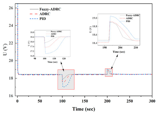 Under PID control, the output voltage overshoot is approximately 8.10%, returning to the set value of 18.5 V after approximately 27 s. Under ADRC control, the output voltage overshoot is approximately 5.41%, recovering to the set value after approximately 18 s. Under Fuzzy-ADRC control, the output voltage overshoot is approximately 2.16%, reverting to the set value within approximately 9 s.