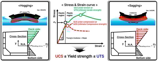 Generally, plated structures utilised in ships and offshore structures are assembled by welding with various stiffeners to satisfy the required structural performance. As highlighted by Paik [1] and IACS [2], in recent years, the Ultimate Limit State Design (ULSD) approach has received increasing attention in structural design from Working Stress Design (WSD). Due to the predominant vertical bending moments on ocean mobilities, such as ships and ship-shaped offshore structures, the tertiary members (i.e., plates and stiffeners) that compose the mid-ship section of the ocean mobility are subjected to compressive and tensile loads. In particular, stiffened panels at the deck and bottom are severely exposed by axial loadings that are proportionate to their distance from the neutral axis. In the case of tension, as shown in Figure 1 (green-coloured line), it is often assumed that the material model maintains its yield strength after yield, which is typically Elastic Perfectly Plastic (EPP) or perfectly bi-linear behaviour, while in the case of compression, the prediction of ultimate strength performance, including buckling collapse characteristics, is important.