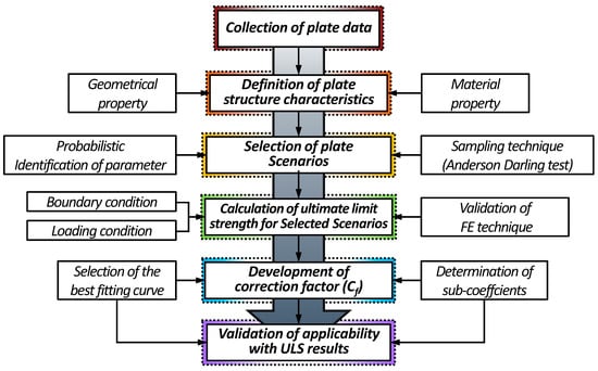 The overall figure for predicting the ultimate limit state (ULS) of the plate under longitudinal compression, including the correction factor () development procedure, is summarised in Figure 3.