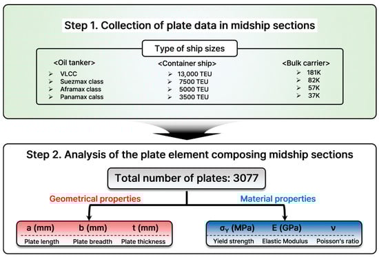 In the case of plates, 600 cases of plates were selected. In brief, the selection process was based on the results of Kim et al. [8], presented in Figure 4, which extracted the plate properties used in a total of 12 ships of various sizes, especially in the mid-ship section, and analysed their probabilistic characteristics. The geometries such as plate slenderness ratio, length (, length), width (, breadth), and thickness (t, thickness) are defined. In addition, material properties should also be defined. Poisson’s ratio is typically assumed to be 0.3, and for elastic modulus (), 205.8 GPa is applied in shipping industries. The material yield strength is one of the important factors where mild steel ( = 235 MPa) and high tensile steel (AH32 = 315 MPa) are generally used in shipyards. In this study, additional values of 355 MPa and 390 MPa were considered to investigate the material yield strength effect.