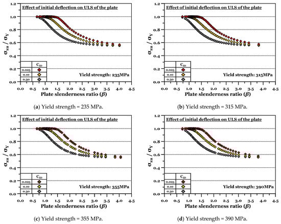 The ULS data were collected from the selected scenario-based NLFEM, and the effect of the initial deflection amount was analysed by yield strength, as shown in Figure 6. It can be seen that the larger (=severe) the initial deflection amount, the lower the behaviour of ULS, regardless of the yield strength. It means that the initial deflection amount more significantly affects the ULS than material yield strength. In Equation (7), where is the FEM data of the ULS on the left side, the right side can be calculated from the plate dimensions. Since simply-supported BC is only considered in this study, the value of is considered to be 4.0. Figure 7 is a versus plate slenderness ratio () diagram, as initial deflection amount and yield strength vary.