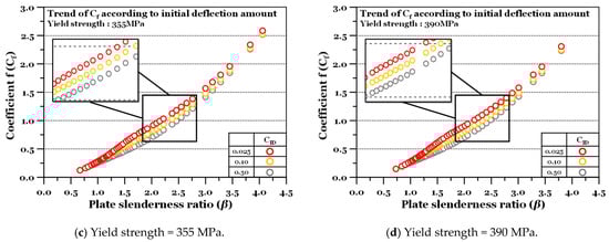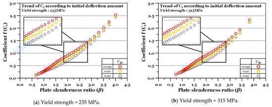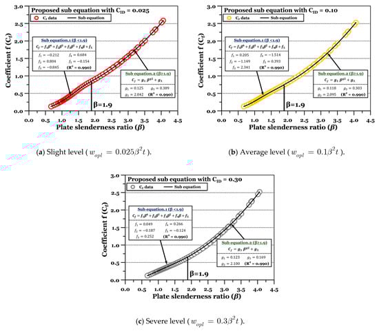 It seems that the influence of the plate’s ULS behaviour also affects the trend. To ensure accuracy, correction factors (or sub-equations) (Equation (8)) were developed by dividing the ranges based on beta at 1.9. Table 2a,b summarise the coefficients obtained from the regression analysis according to the amount of initial deflection. To verify the accuracy, we calculated the statistical value of and confirmed its applicability (above 0.99 on average).