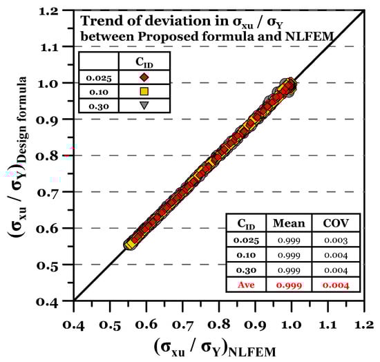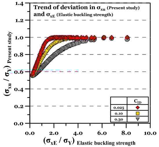 Trend of the deviation in σxu (present study) and σxE (elastic buckling strength).