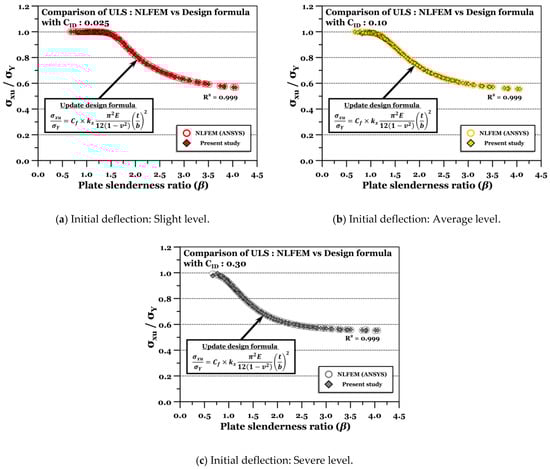 Figure 9 presents the validation results of the ultimate strength predicted by the proposed formula in this study (Equation (9)) with the NLFEM analysis results. It can be seen from the mean values and coefficient of variation (COV) that the developed design formula predicts the compressive ultimate strength of the plate considering three initial deflection levels (0.025, 0.1 and 0.3) with good agreement. Figure 10 compares the ULS behaviour according to beta with different amounts of initial deflection.