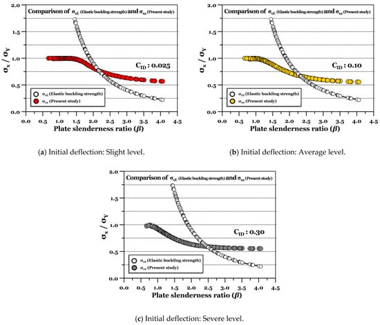 The ultimate strength of the plate predicted by the updated design formula was compared with the elastic buckling strength calculated from Equation (3). Figure 11 shows the deviation of the ultimate compressive strength from the elastic buckling strength, and Figure 12 presents the comparison results by initial deflection.