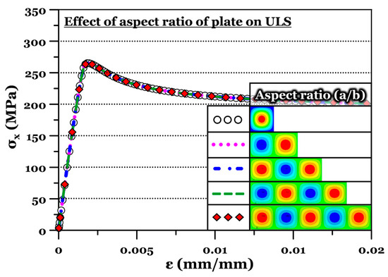 In addition, we can also consider the effect of the plate aspect ratio (=a/b or plate length/plate width) on the ultimate strength of the plate in longitudinal compression. In this study, we adopted a single value of the plate aspect ratio (a/b = 5.0), because the aspect ratio has less effect on the ULS of the plate as shown in Figure 14. If the aspect ratio (a/b) is not an integer, it is available to calculate the ULS by utilising the result that satisfies the nearest integer to that value. This may enable predicting the lowest ULS.