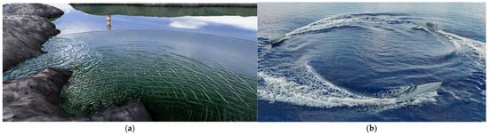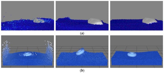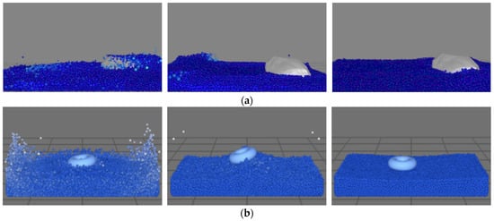 Currently, there are two main methods for wave simulation: spectrum-based [1,2,3] and physics-based [4,5,6]. The former has better real-time performance but experiences difficulty in showing the details of the waves; the latter is more computationally intensive but provides a stronger sense of realism. As illustrated in Figure 1, the waves generated using spectrum-based methods (Figure 1a) exhibit a more regular and less dynamic appearance, whereas the physics-based methods (Figure 1b) produce wake waves with more realistic turbulence and interactions. With the rapid improvement in computer computing power, physics-based methods have received increasing attention. Physics-based methods can be further categorized into Eulerian and Lagrangian methods. The Eulerian method simulates the movement of waves on a cell using a fixed grid cell, which has the disadvantage of being susceptible to time-step limitations. The Lagrangian method simulates waves via a series of discrete control equations for water particles that have physical quantities, such as velocity, position, and pressure. Compared with Euler’s method, this method is more suitable for simulating the complex and intense motion of ocean waves while providing a strong sense of realism. The smooth particle hydrodynamics method, which can effectively ensure the conservation of mass and has a faster computational speed, has become a research hot spot.