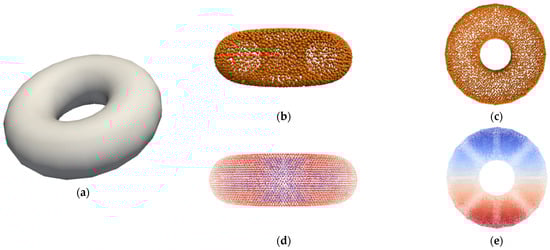 A comparison of the sampling effect of the lifebuoy: (a) the mesh model of the lifebuoy used in this article; (b) a front view of the particle-based representation; (c) a top view of the particle-based representation; (d) a front view of the volume map representation; (e) a top view of the volume map representation. In (d,e), a color gradient from blue to red is used to enhance the sense of depth by differentiating particles based on their front-to-back order.
