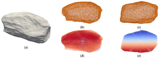 Table 1 lists the processing results for two different 3D rigid body models using different boundary representations. Among them, the particle-based representation of the rigid body model is processed using the 3D Poisson disk sampling algorithm, and the final sampling results obtained are shown in Figure 2b,c and Figure 3b,c. A volume map implicit boundary representation of the rigid body model processing was obtained after using a spatial diagram. In order to make the two comparable, we incorporated the volume map processing results into the SPH method for the 100-step simulation. Then, the simulation results for the part of the rigid body affected by the rigid body were converted into the rigid body contour and output in the form of a point cloud. Figure 2d,e and Figure 3d,e show the results of the two models after volume map processing. Due to the high density of particles resulting from the volumetric map processing, we enhance the sense of depth in the front view and the top view by differentiating particles based on their front-to-back order, using a color gradient from blue to red.
