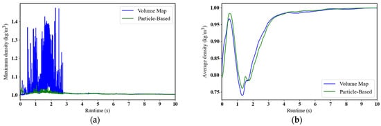 A comparison of the water particle density of the particle-based scheme and the volume map scheme in the lifebuoy overboard scene: (a) a comparison of the maximum density; (b) a comparison of the average density.
