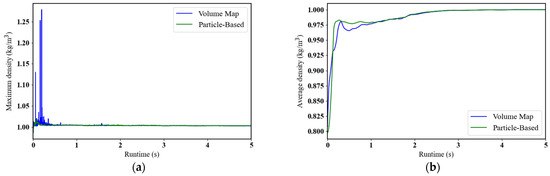 By comparing the peak densities of the two methods for two scenarios in Figure 4a and Figure 5a, we found that the volumetric map method causes the peak density of the fluid particles to fluctuate at the beginning of the simulation and then remain stable. This implies that different boundary treatment methods affect the incompressibility of the wave simulation framework and that the volumetric map method reduces the incompressibility of the water particles.