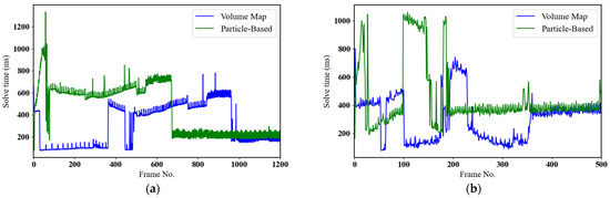 A comparison of the time cost for each frame of the particle-based scheme and the volume map scheme: (a) a comparison of the reef scene; (b) a comparison of the lifebuoy overboard scene.
