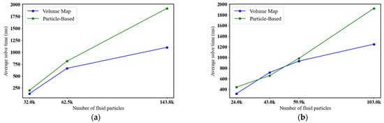 In order to compare the real-time performance of the two schemes more clearly, we expanded the number of fluid particles in each scene and compared the average solving time of different numbers of water particles in the same scene at each time step. As shown in Figure 9, for the weakly coupled scenario (Figure 9a), the volume map scheme is faster than the particle-based scheme for all of them, and this advantage is more obvious with the increase in water particles. For the strong coupling scenario (Figure 9b), although the particle-based scheme solves faster for 43,000 water particles, an analysis of the time data for the four particle sizes in the figure shows that the average solving time of the volume map scheme grows logarithmically with an increase in particle size, whereas that of the particle-based scheme grows exponentially with an increase in particle size. Therefore, for large-scale coupling scenarios, using the scheme in this study can save a significant amount of simulation time.