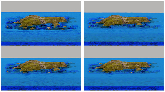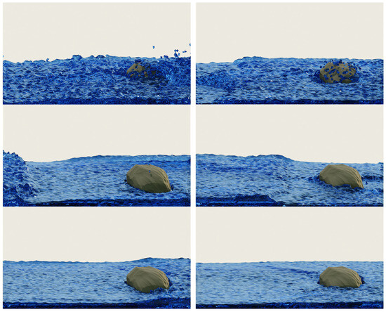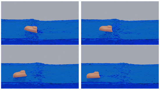 We used the Cycles render engine in Blender 3.6 to render the reef scene and the lifebuoy overboard scene, and the final effect of fluid–solid coupling obtained from the volume map scheme is shown in Figure 10 and Figure 11.