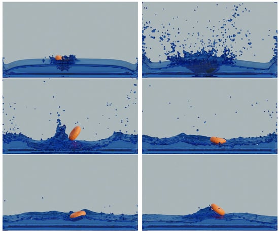 The study in [28] employs the SPH method to investigate a practical challenge concerning maritime safety, and we similarly seek to advance maritime safety through our research. Inspired by the lifeboat-overboard scenario—a ship’s emergency drill described in [10]—Figure 12 presents the simulation results for a lifeboat navigating at sea. The variation in the wake trajectory reveals that the lifeboat’s speed decreases as it traverses waves and its course adjusts under the influence of wave action. These dynamics align with physical principles observed in real-world scenarios. This consistency between the simulation results and real-world phenomena demonstrates the effectiveness of the proposed simulation strategy in this study for assisting shipping companies in assessing navigational safety.