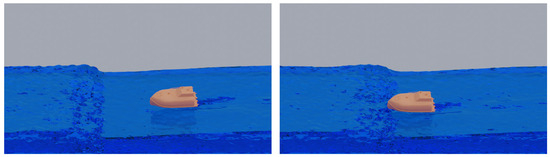 The advantages of the volumetric map approach over the particle-based approach were previously compared and analyzed in detail from the perspective of friction by Bender in [19]; therefore, they will not be repeated in this study. However, a marine simulator visual system places more importance on the balance of realism and the real-time nature of scene simulation. Therefore, our comparison experiments are mainly centered on these two aspects. In the process of comparing realism, we found that the boundary processing method affects the incompressibility of fluid particles.