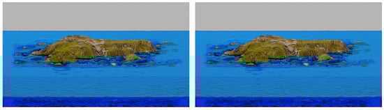 In Figure 8, the particle-based scheme and the volume map scheme in the reef scene, respectively, use 670 and 970 frames to describe the coupling effect between the waves and the reef, and the particle-based scheme and the volume map scheme in the lifebuoy overboard scene, respectively, use 195 and 360 frames to describe the coupling process between the lifebuoy and the water surface. Combined with the statistics on the frame count of the animated scene in Table 2 the two schemes have basically the same number of frames at the end of the coupling, but when describing the coupling process, the pictures of the volume map scheme are more continuous, which implies that the volume map scheme provides a more complete representation of the fluid–solid coupling process. On the other hand, whether it is a weakly coupled scene or a strong coupling, the solving speed of each frame of the volume map scheme is faster than that of the particle-based scheme in all stages of the coupling process. Combined with the statistics on the runtime of the animated scene in Table 2, the volume map scheme is more advantageous in terms of real-time computation.