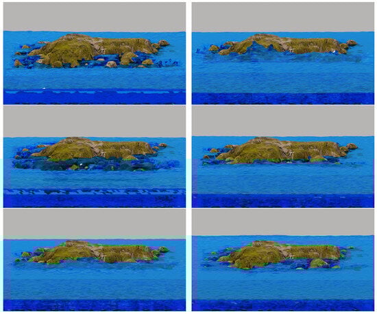 In addition, Figure 13 and Figure 14 illustrate the effect of wind on sea surface changes within the same scenario, demonstrating the applicability of the proposed simulation strategy to environments influenced by wind fields. We select several equidistant time points (10 s, 15 s, 20 s, 25 s, 30 s, and 35 s) to observe the sea surface. Figure 13 presents the simulation results under no wind conditions, where the sea surface no longer changes significantly after 20 s. Figure 14 depicts a wind speed of 10 m/s, where the sea surface continues to move under the influence of the wind. The sea surface under wind conditions more accurately reflects real-world sea movements, aligning with the physical principle that wind serves as the driving force for wave generation.
