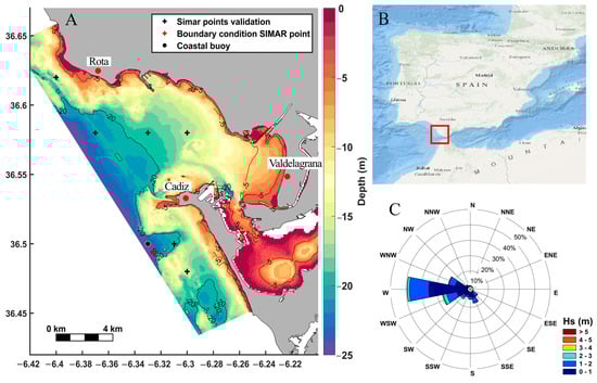 (A) Study area with overlaid bathymetry. (B) Location of the study area, Bay of Cadiz, Andalusia, Spain (C) A wave rose diagram of the significant wave height for a directional wave buoy.