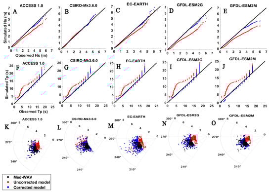 Q-Q plot of significant wave height (Hs) (A–E) peak period (Tp) (F–J). Polar plot for wave heights exceeding 99th percentile (K–O). Uncorrected global wave model (red), corrected global wave model (blue), and Med-WAV reanalysis (black) are represented.