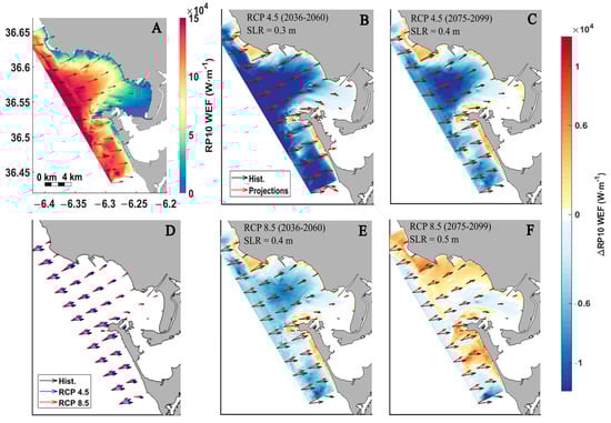 (A) The wave energy flux corresponding to the 10-year return period and the mean direction associated with the 99th percentile or greater of the WEF (black arrow). The absolute change and mean direction associated with the 99th percentile of the WEF for each simulation (red arrow): (B) the 2036–2060 period of the RCP 4.5 scenario, (C) the 2075–2099 period of the RCP 4.5 scenario, (E) the 2036–2060 period of the RCP 8.5 scenario, and (F) the 2075–2099 period of the RCP 8.5 scenario. The sea level rise (SLR) for each period is shown in the bottom left corner and represents the average increase calculated from the five global models used. (D) The mean direction associated with the 99th percentile or greater of the WEF for the historical period (black arrow), the end-of-century period of the RCP 4.5 scenario (blue arrow), and the end-of-century period of the RCP 8.5 scenario (red arrow).