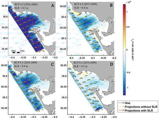 The WEF associated with a 10-year return period (RT10) shows maxima (around 15 × 104 Wm−1) in the outer domain and by the rocky outcrops outside the bay. Minima appear by the coast, where shallow depths and the wave breaking limit reduce the WEF, and inside the bay due to the protective effect of the Cadiz tombolo against wave front propagation (Figure 4A). Under RCP4.5, the WEF associated with RT10 shows a general decrease, slightly increasing only by some coastal stretches, over rocky outcrops and inside the bay (Figure 4B,C). The general WEF decrease is weaker in the end-of-century period than in the mid-century period as a result of the larger SLR. The mid-century RCP8.5 WEF change pattern replicates that of the RCP4.5 WEF, but with a weaker general decrease and slightly larger increments located in the shallower areas (Figure 4E). By the end-of-century period in RCP8.5, there is a general WEF increase, with maxima located at shallow waters and rocky outcrops (Figure 4F). Additionally, a southward shift in the WEF direction is evident in all cases except for RCP4.5 in the mid-future period.