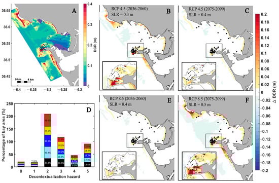 We relate decontextualization hazard (DCR) to the maximum critical diameter of an object (we assume sphericity) susceptible to be displaced due to wave action over a 10-year return period (Figure 6). All projections present a slight general reduction in the value of DCR, except for the bay’s interior and shallower areas, where local significant increases (up to 25%) are observed compared to the historical period. This result aligns with the projected general reduction in the WEF and its local increase in shallower areas. In shallow areas, the wave-induced bottom stress is larger, but as wave orbital velocity strongly attenuates with an increasing depth (Figure S1), DCR is reduced throughout the rest of the bay. The mid-century RCP4.5 and the end-of-century RCP8.5 scenarios exhibit the most substantial hazard changes. However, the result of these changes reflects only as a decrease in the bay area under a hazard score of 3 and an increase in the bay area as a hazard score of 2. The percentages of the bay area classified as high and very high hazards (scores of 4 and 5; Figure 6D) remain nearly unchanged.