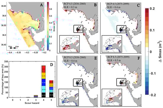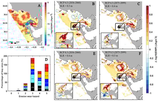 (A) A map of the erosive wear hazard (log of erosive wear potential) for the historical period. The absolute change in this hazard for (B) the 2036–2060 period of the RCP 4.5 scenario, (C) the 2075–2099 period of the RCP 4.5 scenario, (E) the 2036–2060 period of the RCP 8.5 scenario, and (F) the 2075–2099 period of the RCP 8.5 scenario compared with the historical period. The black points indicate the locations of UCH sites. (D) A histogram of the hazard at UCH sites and hazard classes. The sea level rise (SLR) for each period is shown in the bottom left corner and represents the average increase calculated from the five global models used.