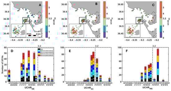 (A) The decontextualization risk (UCHRDE) for UCH sites located in the Bay of Cadiz, (B) the scour risk (UCHRSC) for UCH sites, and (C) the wear erosion risk (UCHREW) for UCH sites. Warm colors indicate a higher risk index, and different shapes refer to the prevalent material (diamonds, metallic material; squares, ceramic material; filled circles, stone; triangles, wood/organic material; pentagons, unknown material). Accumulated graphs of the classification of UCHs in terms of the risks of (D) decontextualization, (E) scour, and (F) wear erosion.