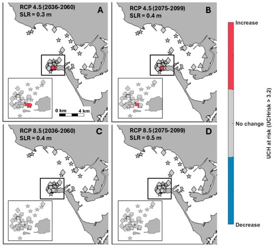 The erosive wear risk (UCHREW) for UCH sites located in the Bay of Cadiz. The absolute change for (A) the 2036–2060 period of the RCP 4.5 scenario, (B)the 2075–2099 period of the RCP 4.5 scenario, (C) the 2036–2060 period of the RCP 8.5 scenario, and (D) the 2075–2099 period of the RCP 8.5 scenario compared with the historical period. The sea level rise (SLR) for each period is shown in the bottom left corner and represents the average increase calculated from the five global models used.
