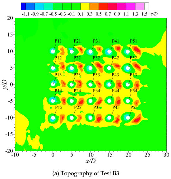 The maximum and minimum scour depths are approximately 0.85D and 0.30D in the case of Test B3 (), respectively. The equilibrium scour depth at the first and fifth column piles is slightly greater than that at the second and fourth columns, with the third column in the middle exhibiting the smallest depth. Although the equilibrium scour depth generally decreases with increasing , the complex interplay of flow fields between the piles results in asymmetric scour phenomena for symmetrically positioned piles in the same row. For example, as shown in Figure 10a–c, except for P11, P15, P51, and P55, where the scour depths are relatively close to each other, there are significant differences in scour depths between other piles, such as P21 and P25. The maximum difference is between P41 and P45 and is 0.35D (0.78D–0.43D), representing an 81.4% discrepancy. A similar situation is observed in the second and fourth column piles, particularly in the second and third rows with piles P21, P25, P31, and P35, as shown in Figure 10a–c. The equilibrium scour depth of the third column piles exhibits more irregular variations, as indicated by the blue data in Figure 10a–c. The maximum and minimum scour depths occur at the first row pile P13 and the second row pile P23, with scour equilibrium depths of 0.68D and 0.31D, respectively. Polynomial and linear fittings were performed on the scour equilibrium depths of the third column piles P13, P23, P33, P43, and P53 at , as shown by the solid and dashed blue lines in Figure 10c. It can be observed that the scour equilibrium depth of the third column piles fluctuates around an average value of 0.5D in Test B3.