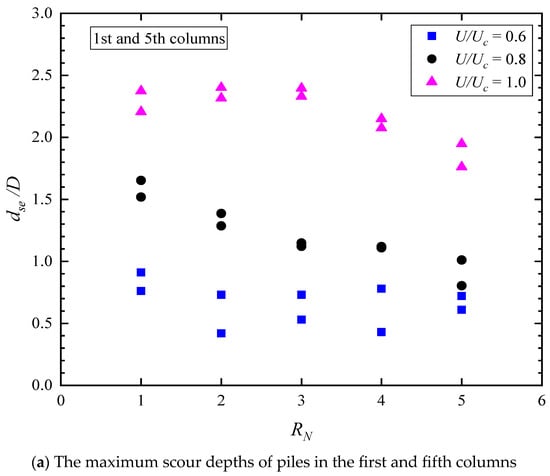 When , as shown by the black data points in Figure 10a–c, the equilibrium scour depths of the piles from the first to the fifth column decrease approximately linearly with the row number RN. The equilibrium scour depths of the piles exhibit good symmetry, with the maximum difference being 0.198D (1.01D–0.803D), which is 24.7% and is located between the first column pile P15 and the fifth column pile P55. The scour depths of the other piles are very close to each other. Compared with the condition at , the scour depths of the piles are significantly increased. Taking the second row, third column pile P23 as an example, scour depth at is about three times larger than the scour depth at .